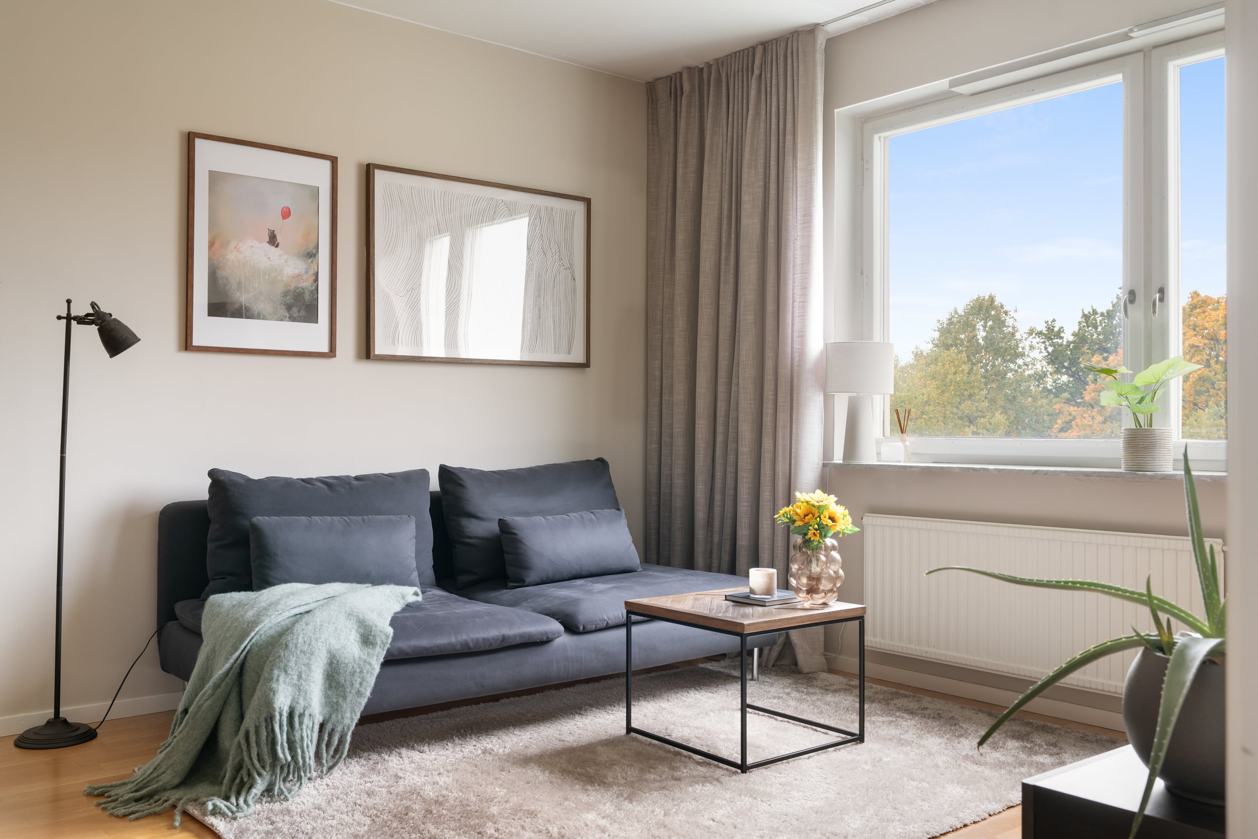 Ett fräscht vardagsrum där parketten glänser och väggarna bjuder in till personlig inredning. Rummet är generöst nog för både matplats och soffhörna – perfekt för middagar med vänner eller mysiga filmkvällar. Ljuset flödar in och skapar en varm atmosfär året runt.