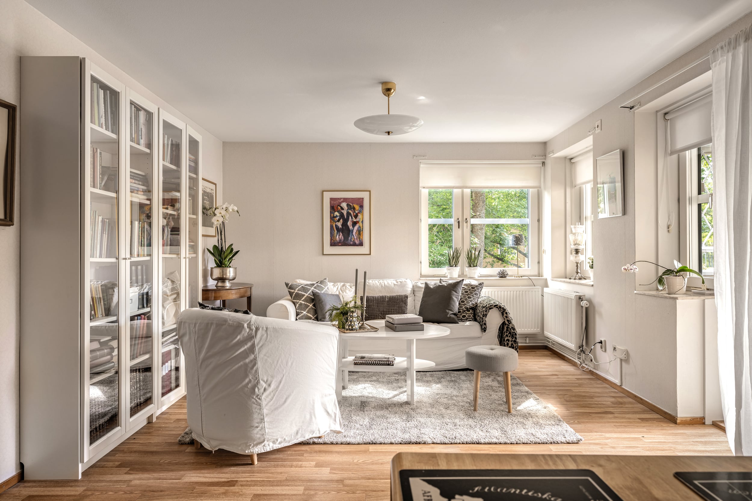 Inbjudande vardagsrum med laminatgolv och tapetserade väggar. Härifrån når du den härliga balkongen. Dessutom finns fönster i två väderstreck som ger ett generöst ljusinsläpp.
