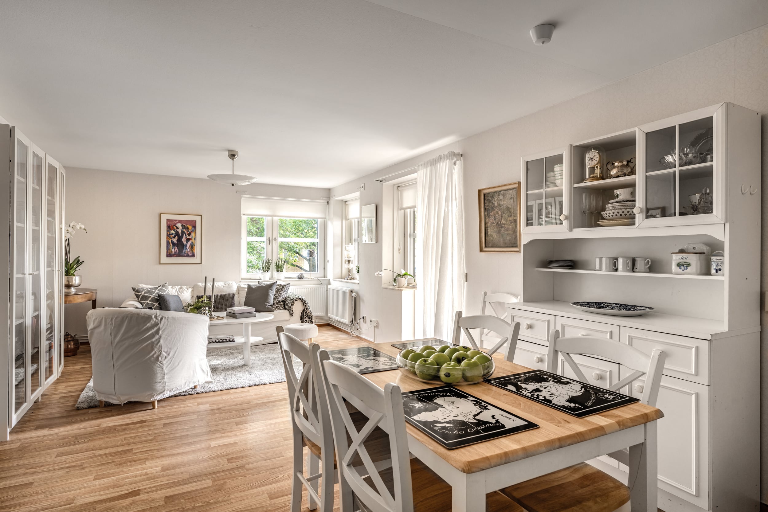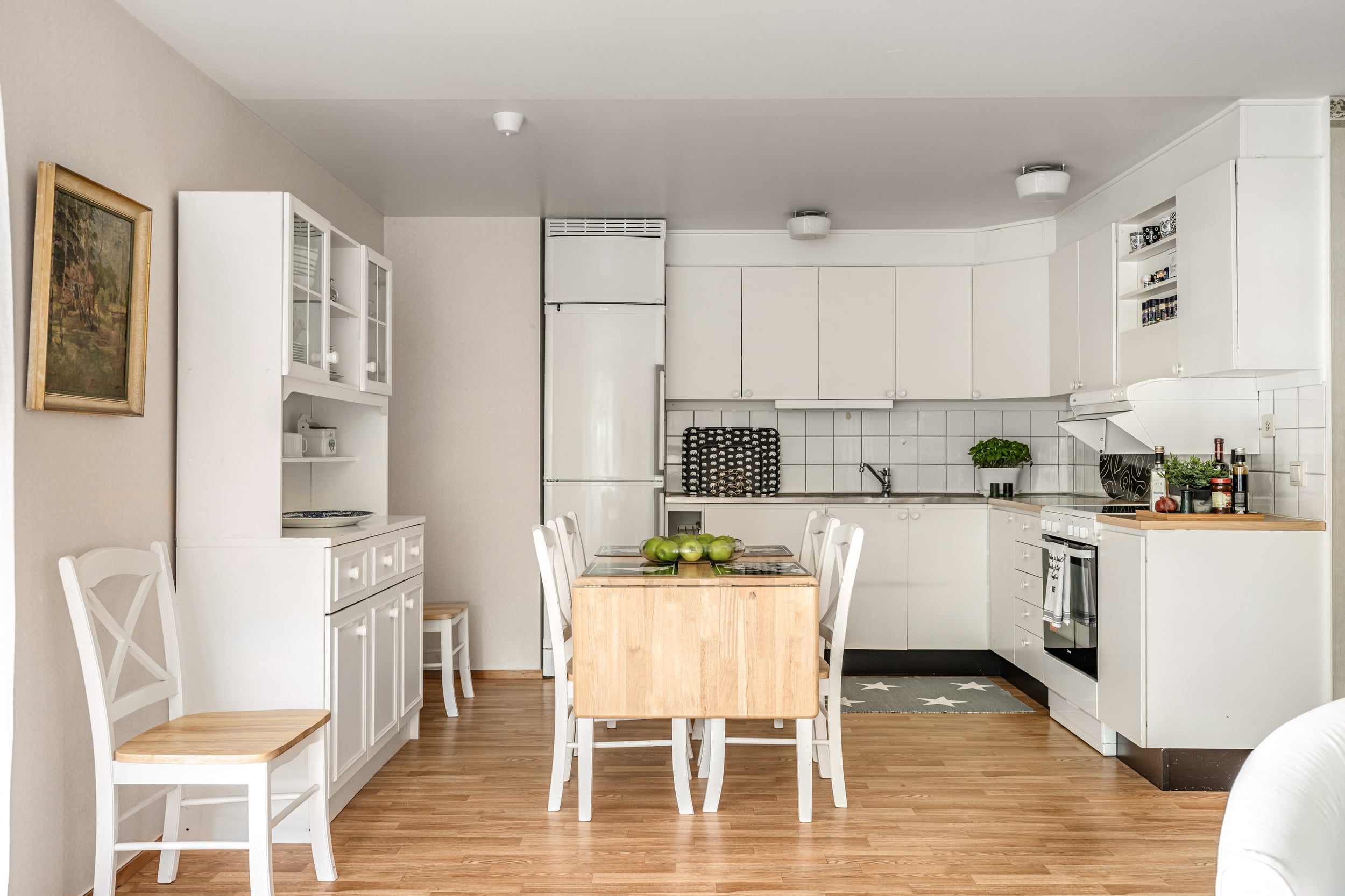Luftigt och trevligt kök med plats för ett matbord. Laminatgolvet kombineras med tapetserade väggar, vita skåpluckor och en rostfri diskbänk med vitt kakel ovanför. Kyl/frys, spis med häll och fläkt integreras snyggt i den öppna planlösningen mot vardagsrummet.