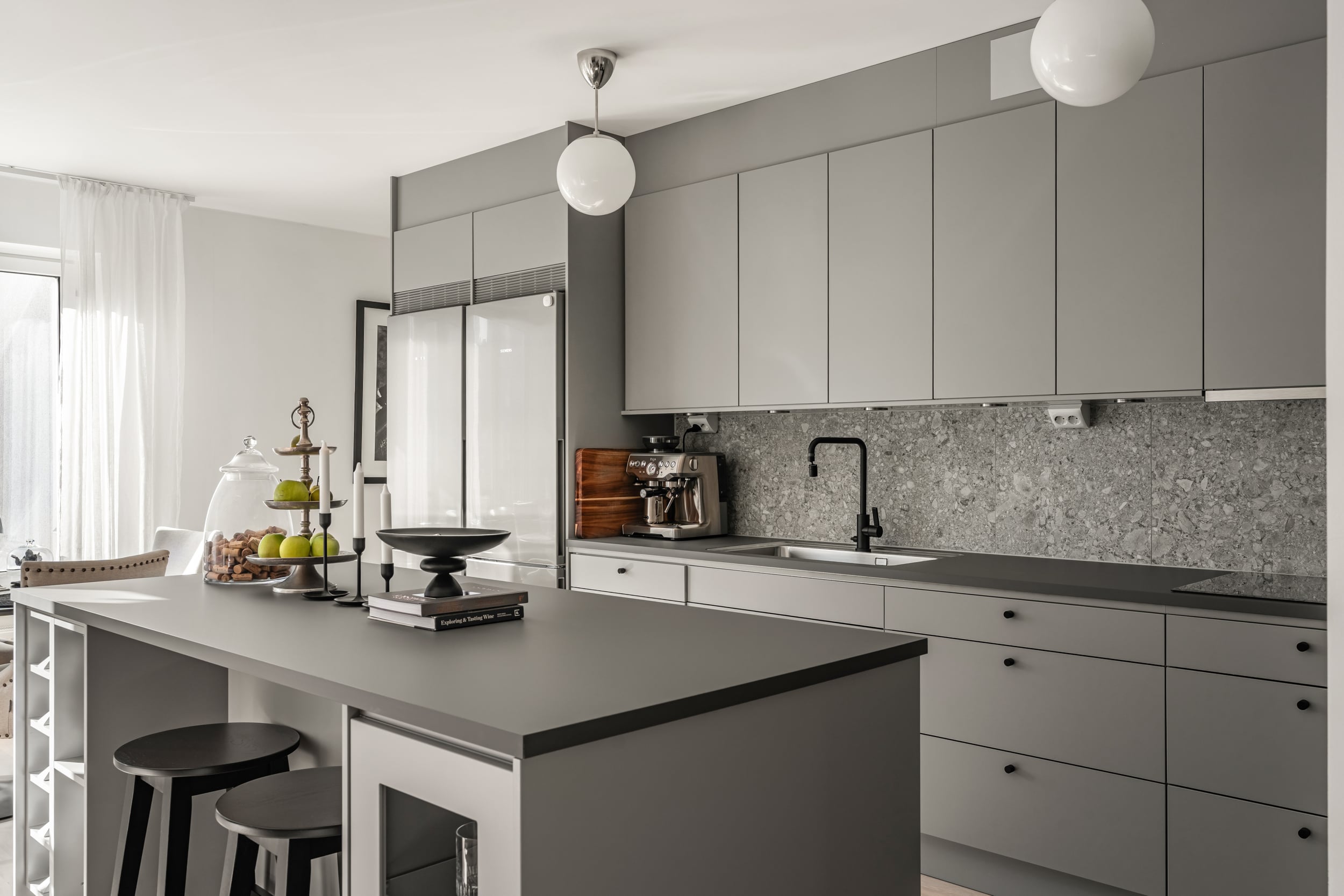 Det stilrena köket i vinkel bjuder på grå luckor som ger en modern och sofistikerad känsla. Här finns dubbel kyl/frys, inbyggd ugn och mikro, diskmaskin samt en induktionshäll som gör matlagningen till ett nöje. Den generösa köksön erbjuder både förvaring och arbetsyta, och intill finns plats för ett matbord där middagar kan avnjutas i goda vänners lag. Köket smälter sömlöst samman med vardagsrummet – ett socialt nav för både vardag och fest.