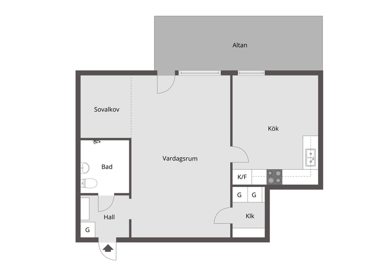 Rymligt vardagsrum med parkettgolv och tapetserade väggar. En sovalkov ger extra flexibilitet och möjlighet till avskildhet. Från vardagsrummet når du altanen – perfekt för sommarens måltider och avkoppling.