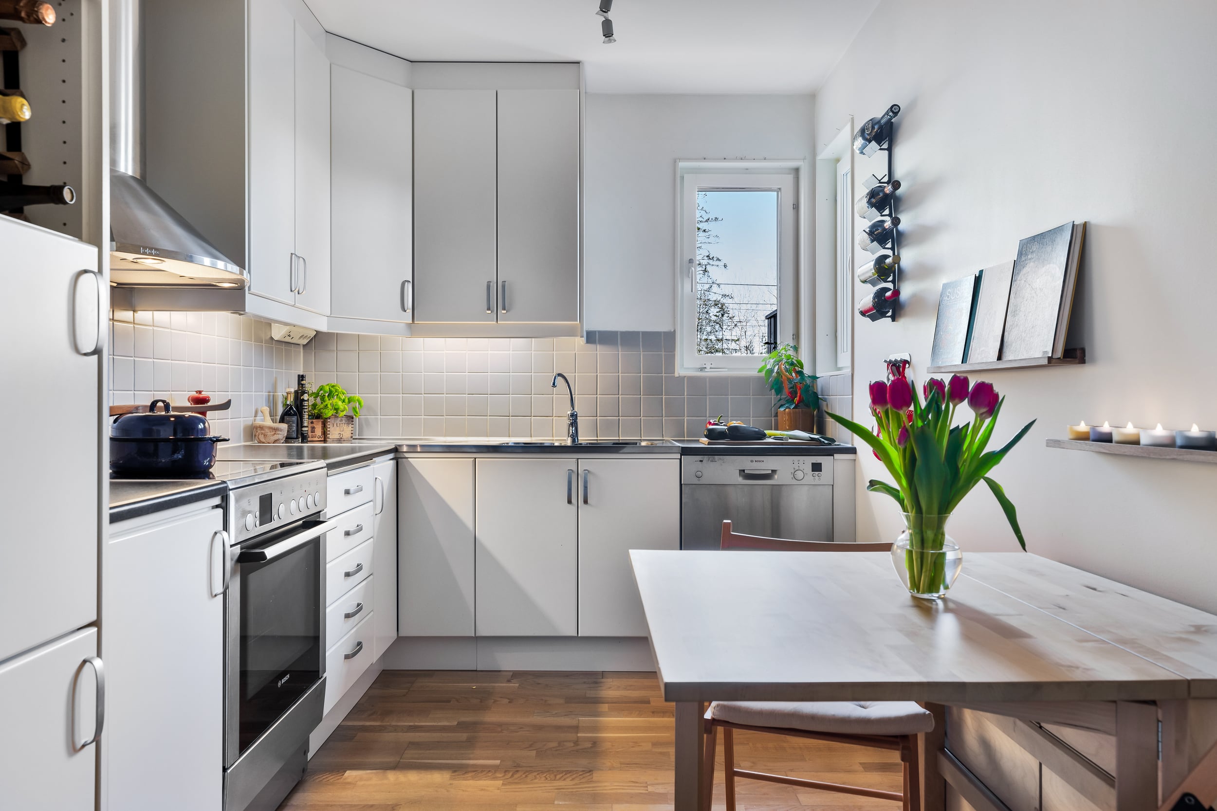 Praktiskt kök i L-form med vita köksluckor, arbetsbänk i laminat och rostfritt stål med grått kakel ovan. Kyl/frys, spis, ugn och diskmaskin.