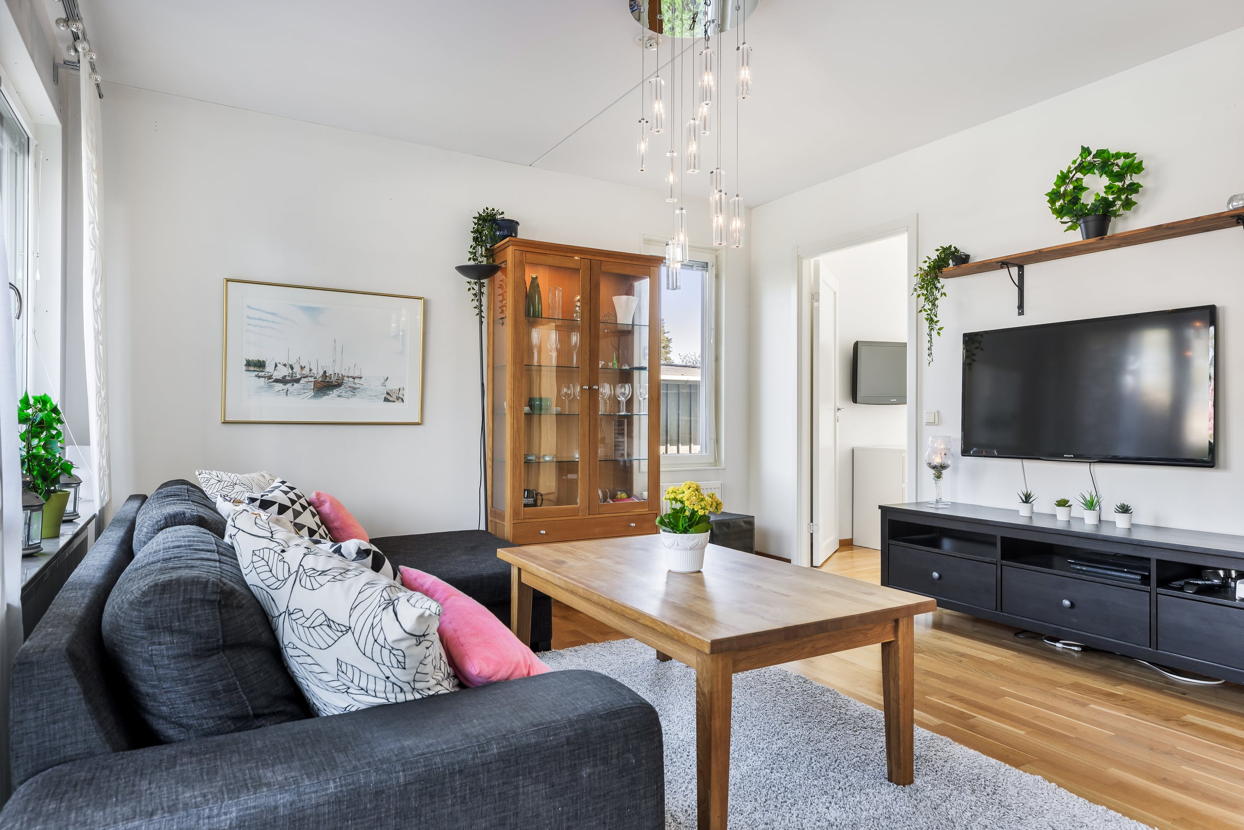 Rymligt och ljust vardagsrum med fönster i flera väderstreck vilket bidrar till ett fint ljusinsläpp i rummet. Plats för sällskapsmöblemang. Från vardagsrummet tar ni er ut till den trevliga tredäckade altanen.
